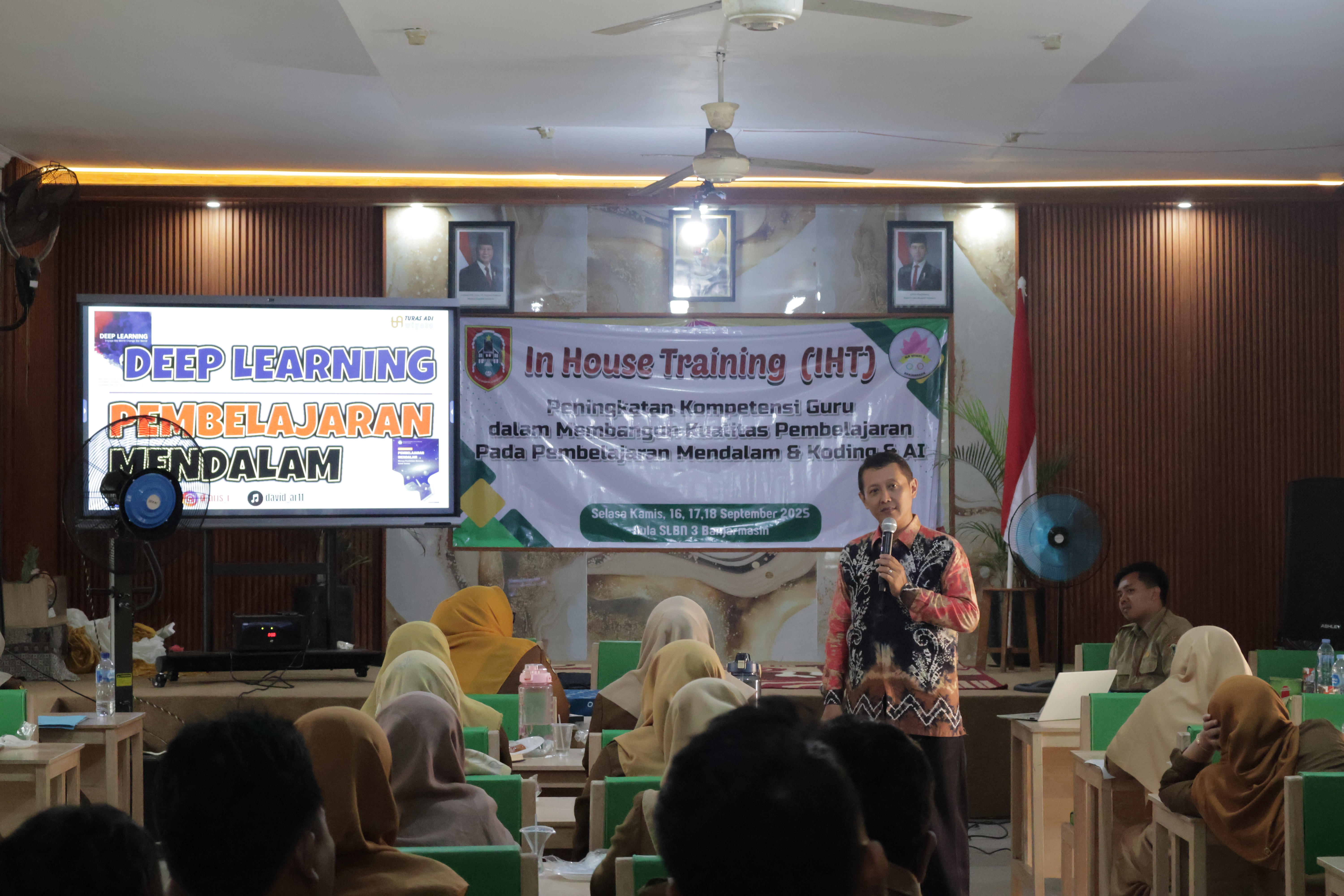 Banjarmasin — Dalam upaya meningkatkan kualitas pembelajaran bagi peserta didik berkebutuhan khusus, SLB Negeri 3 Banjarmasin menyelenggarakan In House Training (IHT) yang bertema "Peningkatan Kompetensi Guru dalam Membangun Kualitas Pembelajaran: Pembelajaran Mendalam & Koding AI" pada tanggal 16 hingga 18 September 2025. Kegiatan ini menghadirkan pemateri berpengalaman, Pak David Aris Raharja, yang dikenal sebagai ahli dalam bidang teknologi pendidikan dan kecerdasan buatan.